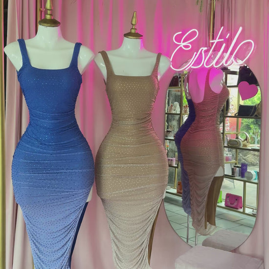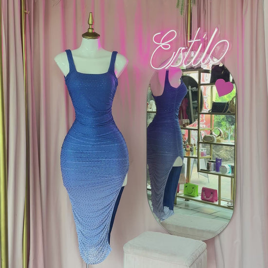 Diseñado para realzar tu figura, su corte ajustado tipo sirena con fruncido lateral crea una silueta de impacto. Confeccionado en tono azul con tela stretch y adornado con delicadas aplicaciones brillantes, es ideal para destacar en eventos de noche, fiestas o cenas especiales.