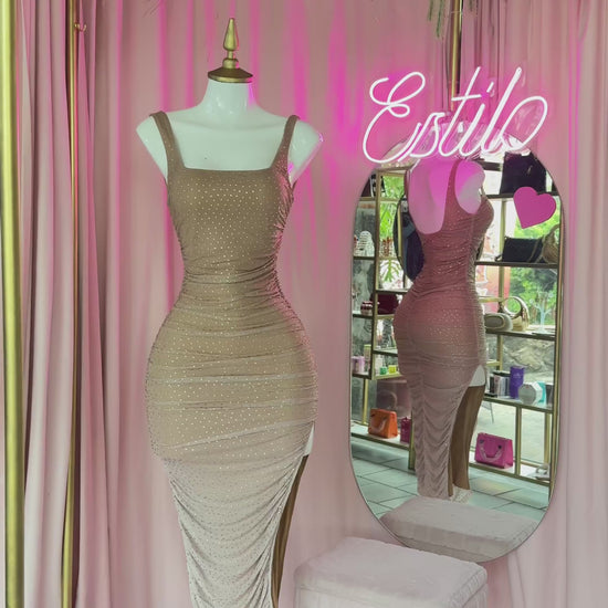 Diseñado para realzar tu figura, su corte ajustado tipo sirena con fruncido lateral crea una silueta de impacto. Confeccionado en tono nude con tela stretch y adornado con delicadas aplicaciones brillantes, es ideal para destacar en eventos de noche, fiestas o cenas especiales.
