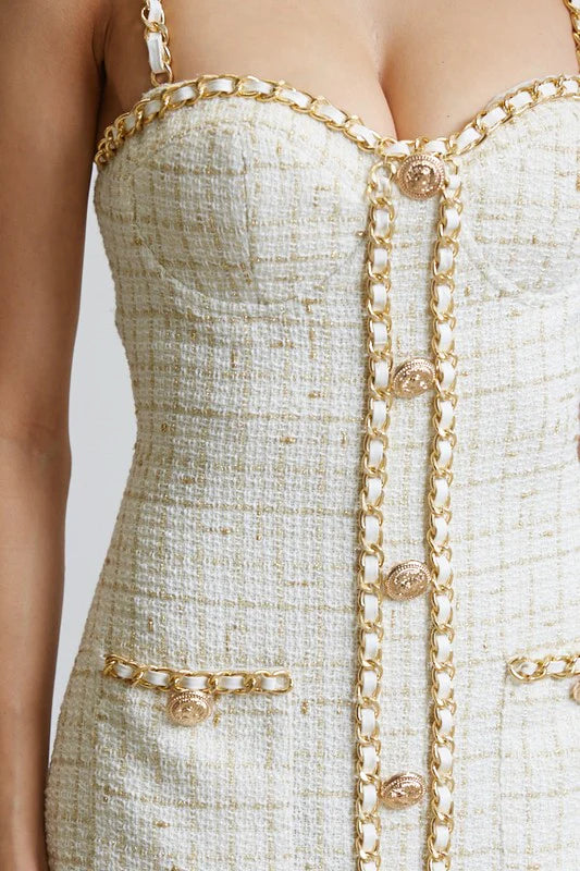 Refinamiento y estilo se unen en este elegante vestido de tweed blanco, adornado con delicados acentos dorados. Encanto Chic destaca por su diseño estructurado y su sofisticación atemporal, ideal para quien busca un look clásico con un toque moderno.