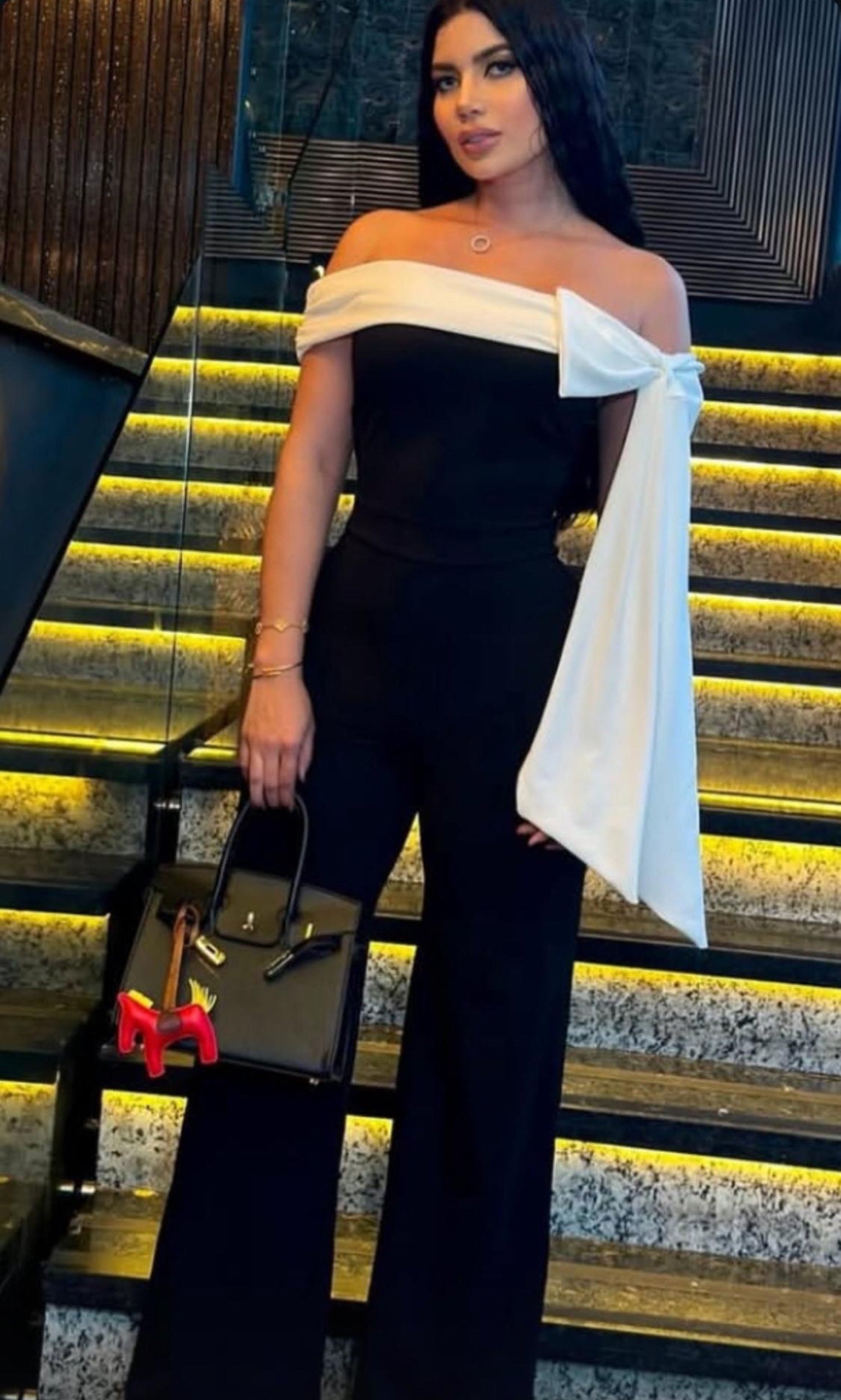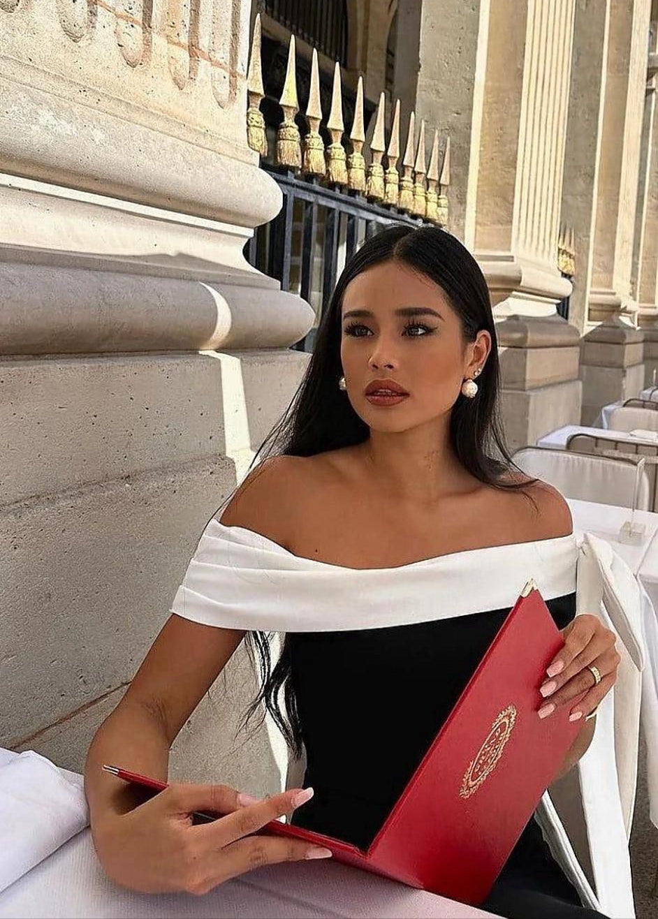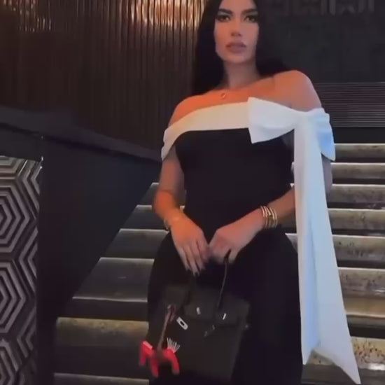 Su diseño en blanco y negro crea un contraste atemporal, mientras el lazo caído sobre el hombro aporta un detalle delicado y distintivo.