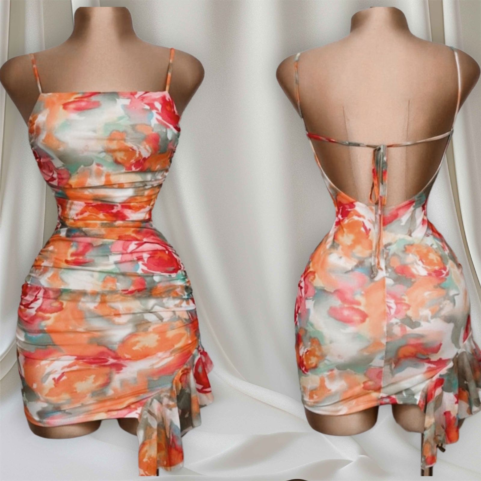 Un vestido que captura la magia de los atardeceres tropicales. Con un vibrante estampado floral en tonos naranjas y rojos, este diseño realza la silueta femenina con un toque fresco y elegante.
