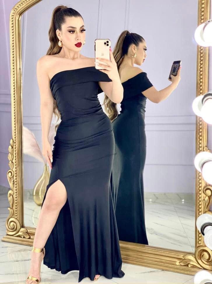 Vestido largo de silueta fluida y femenina, con un escote cowl o drapeado que cae elegantemente. Su punto focal es el detalle escultórico de una flor tridimensional en el hombro. El tejido es un satín lujoso que se desliza con ligereza, ofreciendo un acabado pulido. La falda cae hasta el suelo, creando un movimiento etéreo. Una prenda de pasarela, ideal para galas, bodas formales y eventos que exigen un look pulido y memorable.