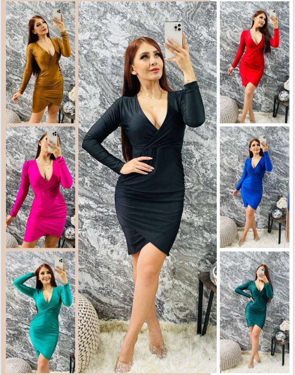 Minivestido de silueta audaz y envolvente, diseñado para capturar la atención. Presenta un escote en V profundo que se integra con un diseño cruzado (wrap) en el busto. El tejido se ajusta a la figura, creando un drapeado estratégico y asimétrico en el talle y la falda. Las mangas largas equilibran la longitud mini del bajo. Una prenda de alto impacto, ideal para noches de fiesta o eventos donde se busca un look seguro, moderno y vibrante.