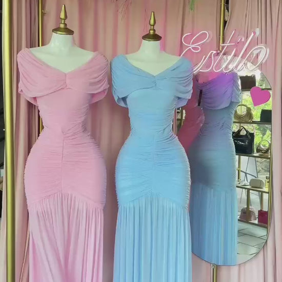 Vestido largo con escote off-shoulder y un diseño completamente drapeado en la parte superior y el torso, creando un efecto ajustado y favorecedor. La falda combina una capa drapeada en la zona de la cadera con una caída ligera y semitransparente en la parte inferior, aportando movimiento y fluidez.