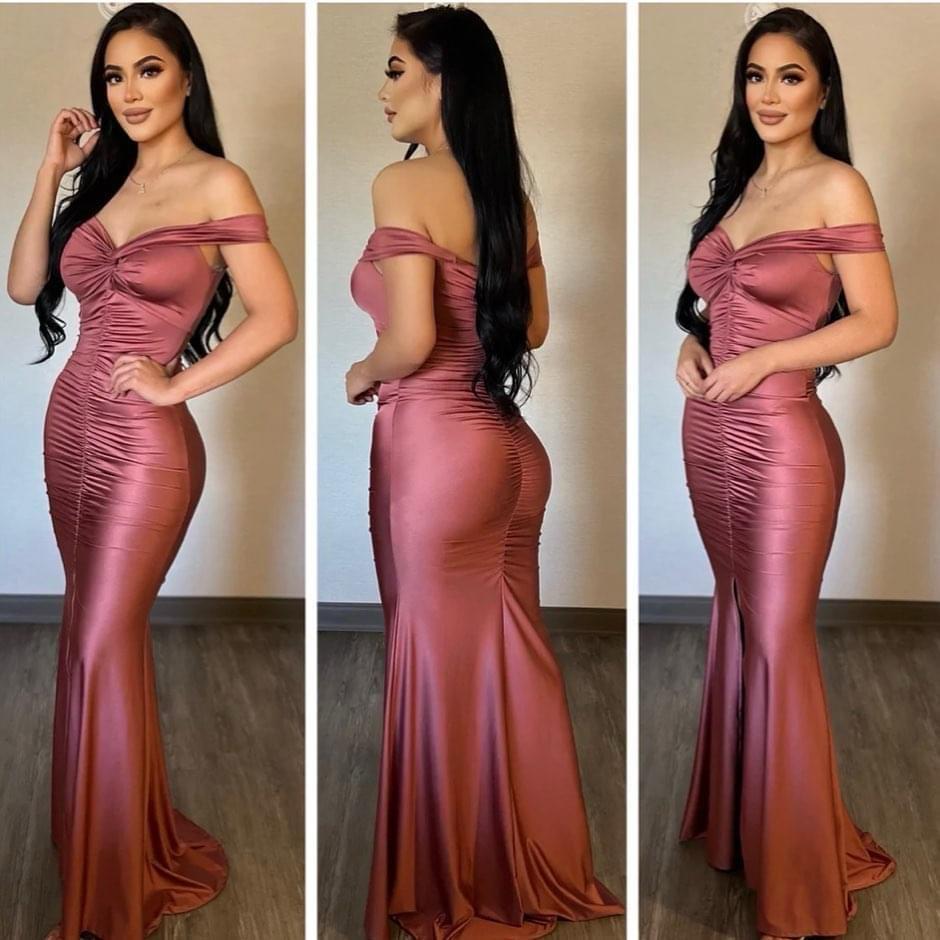 Vestido largo de gala con un elegante escote ** off-the-shoulder (hombros descubiertos)** con diseño cruzado o drapeado en el busto. El tejido sedoso está completamente fruncido (drapeado) en el talle, lo que moldea y define la figura de sirena. La falda cae con una abertura alta en la pierna que añade movimiento y sensualidad. Ideal para bodas, cenas de gala y eventos formales nocturnos que exigen un look sofisticado y escultural.